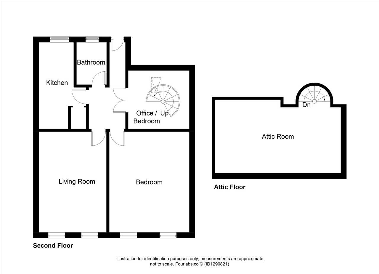 The second bedroom, accessed from the hall, is bright and airy thanks to a ceiling Velux window and further benefits from a spiral staircase leading to a floored attic space measuring over 22 feet, complete with a skylight—ideal for additional storage, a home office or creative use.
